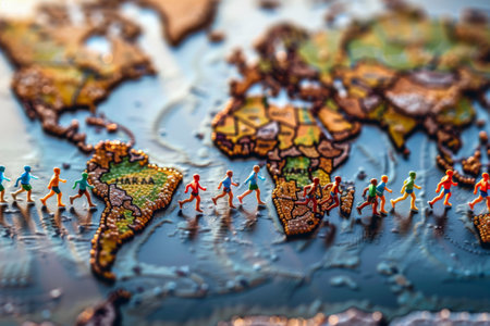 Miniature Humans: Humans run across the world map. The concept of a world running day.