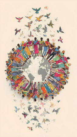 Diverse group of people standing in circle with painted world map on ground, symbolizing unity, connection, and global awareness