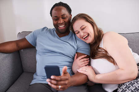Couple in love laughing and looking at the smartphone while sitting at the sofa