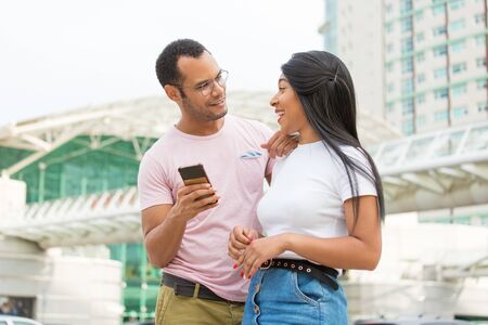 Joyful friends looking at each other on street. Cheerful young people with modern phone posing. Technology concept