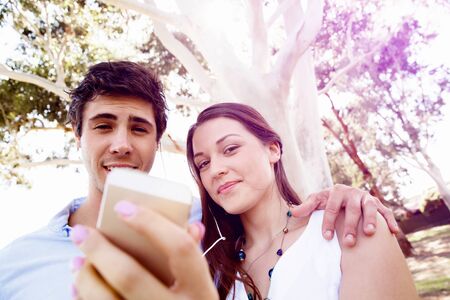 Happy smiling couple taking selfie, kiss and take pictures on sm