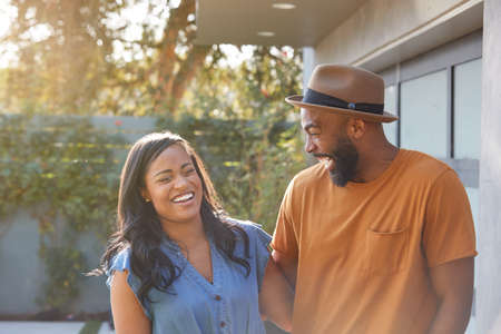 Portrait Of Smiling African American Couple Talking And Laughing In Garden At Home