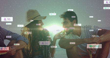 Image of social media emoji icons over diverse couple. Global social media, computing and data processing concept digitally generated image.