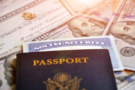 Social Security Card and US Citizen Passport. Documents, money.