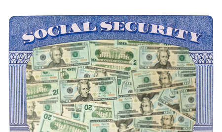 Concept of social security and retirement funding issues in USA with many US dollars laid out in inside the framework of a social security card