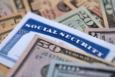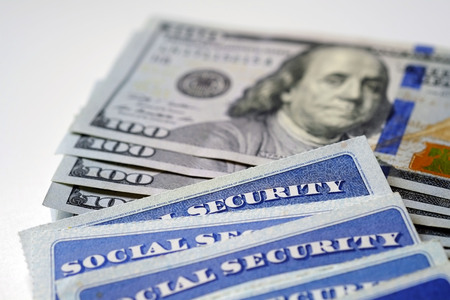 Social security card with US currency. Retirement benefit concept