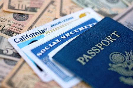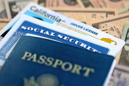 Social security number and California driving license with passport on US dollar money bills close up