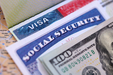US Visa, Social Security Card and hundred dollar bills closeup macro