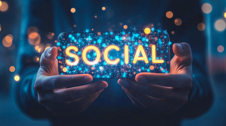 Futuristic interactive holographic social text icon shining over mobile phone in hands