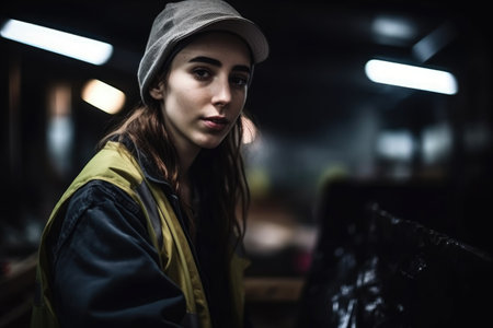 A young volunteer in a yellow vest sorts waste in a warehouse, embodying eco-conscious practices.