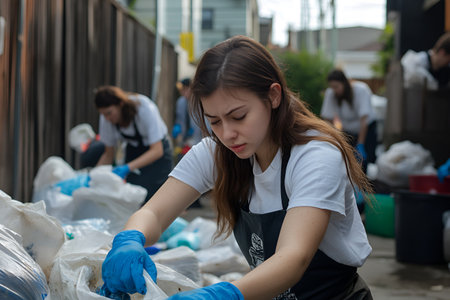 A dedicated woman volunteer carefully sorts waste for recycling during a community cleanup event, promoting environmental responsibility.
