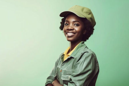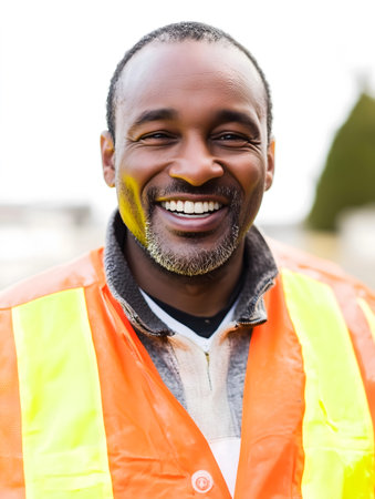 A smiling senior African female construction worker standing in construction site. Generative AI AIG19.