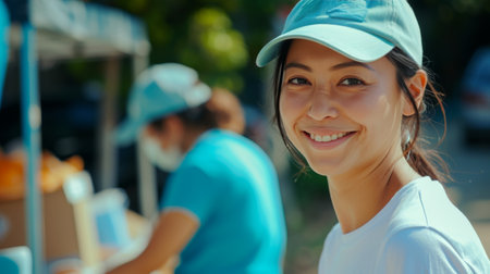 a team of volunteer woman in a community working together at an outdoor booth in sunny day AI generated