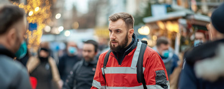A dedicated ER doctor provides assistance to a patient on a stretcher amid a bustling urban setting. The image captures emergency response in action, showcasing teamwork and care.