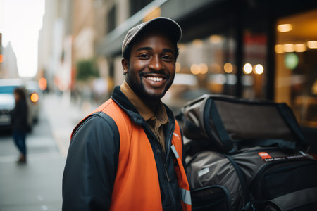 depicts a diligent parcel delivery worker. Show them with a uniform, carrying a stack of packages,