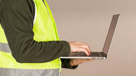 A young man, a Builder in the green safety vest, using a computer, on a gray background. Technology in industrial works