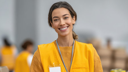 The close up picture of the hispanic female volunteer is working while wearing volunteer vest with blur background and looking at something, the volunteer require skill teamwork and an empathy. AIG43.