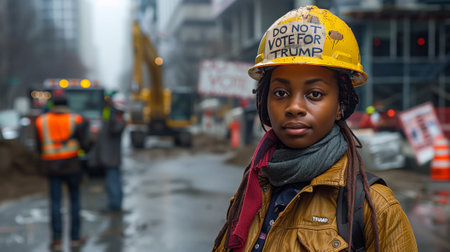 Featuring a proud middle-aged woman wearing a work vest and construction hard hat, she is seen working on a construction site.