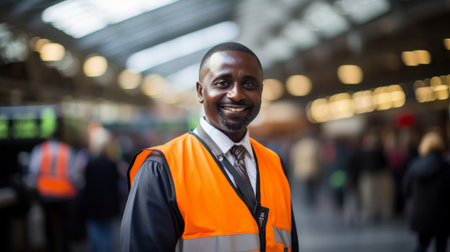 A friendly airport staff member engages with passengers, providing assistance and support in a vibrant air terminal. The environment reflects warmth and professionalism.