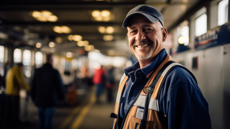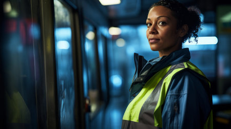 Portrait of resilient city bus driver in early 40s managing bus stop during rainy evening