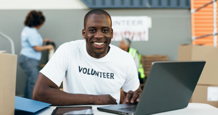 Volunteer man, laptop and portrait for donation, clothes drive and smile for community service, scroll and web. African person, pc and social responsibility with boxes, charity and ideas for helping
