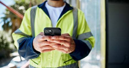 Hands, phone and construction worker with texting, person or contact with info for building development. Engineer, smartphone and check with network, notification or email on mobile app at property