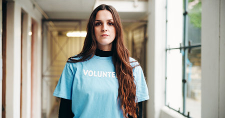 Portrait, NGO and woman with community service, pride and support for recycling. Volunteering, person and girl with tshirt, earth day and humanitarian project with confidence and clean environment