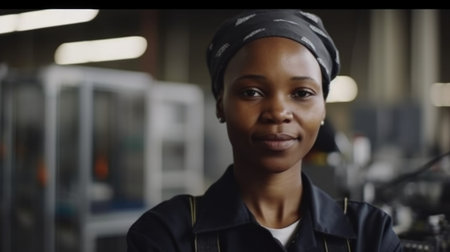 A smiling African female electronic factory worker standing in factory. Generative AI AIG19.