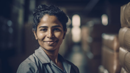 A smiling Indian female factory worker standing in warehouse. Generative AI AIG19.