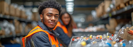 Garbage sorting and recycling concept: interracial sorters wearing safety vests and protective gloves remove plastic containers from bags and sort rubbish together.