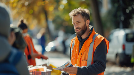 A smiling older woman in an orange safety vest holds a clipboard, radiating positivity as she supervises a bustling community event. Her enthusiasm and leadership shine through, inspiring teamwork and collaboration among volunteers