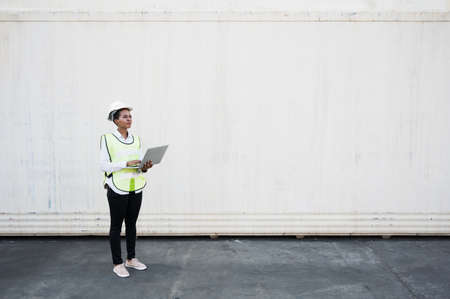 Black foreman woman worker working checking at Container cargo harbor holding laptop computer to loading containers. African dock female staff business Logistics import export shipping concept.