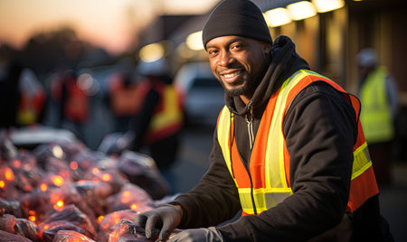 Portrait of African volunteer standing outdoors with his arms crossed and smiling at camera, he helping homeless people