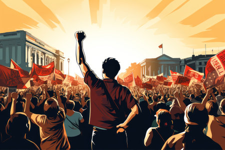 Fists in the air, workers power, labor day concept. Workers protest on the street, strike. Generative ai.