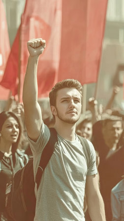 Young activist raising fist in protest among crowd holding flags