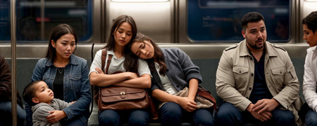 Different sitting in subway car, two young women sleeping, Asian mom and her son, a man talking