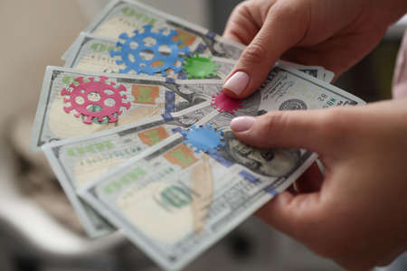 Female hand holds one hundred dollar bills on pasted bacteria virus. What diseases can you get infected through money concept