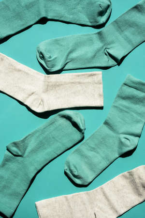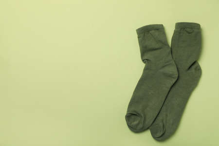 Set of warm socks in gray shades on a pistachio-colored background. High quality photo