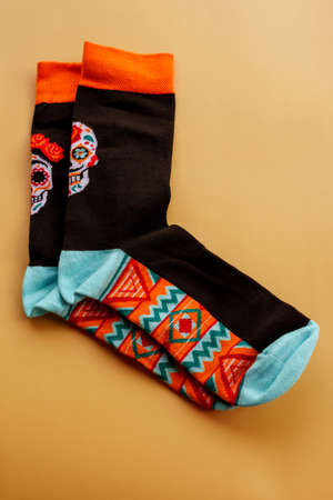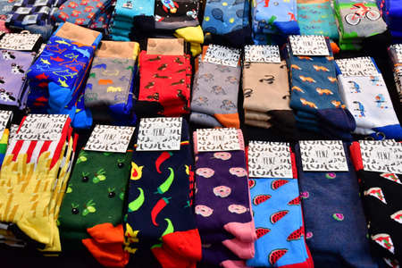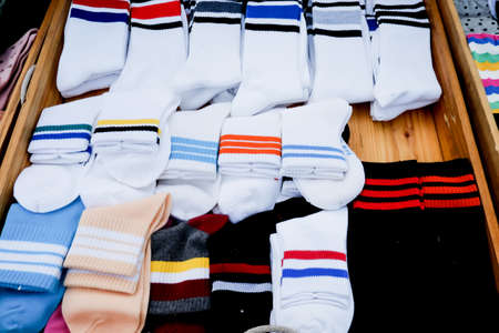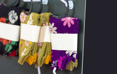 Color socks in the store, Tokyo, Japan. Frame for text. Close-up