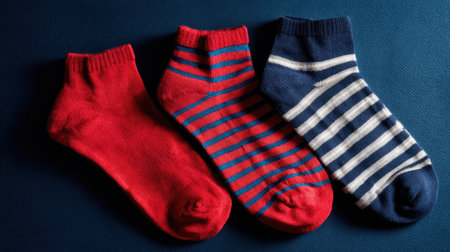 Three pairs of socks are displayed on a blue surface. The socks are red, striped red and blue, and navy blue with white stripes. They showcase a variety of styles suitable for everyday wear.