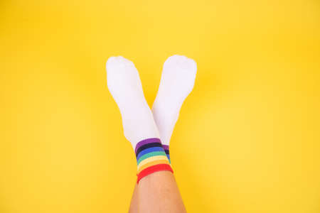 Legs with different stripes socks on background with copy space. World Down syndrome day background. Down syndrome awareness concept.