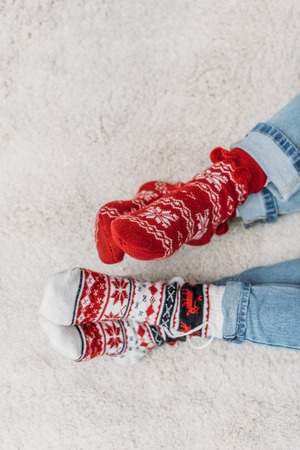 Cropped image couple sitting on carpet in jeans and red Christmas socks
