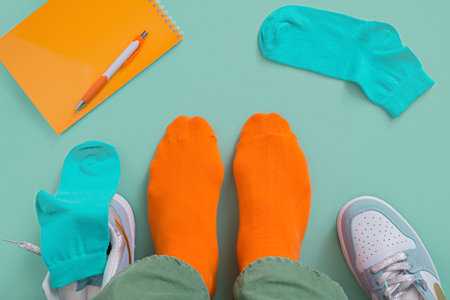 Feet of a man in orange socks and green jeans. Teal background with notepad and pen.