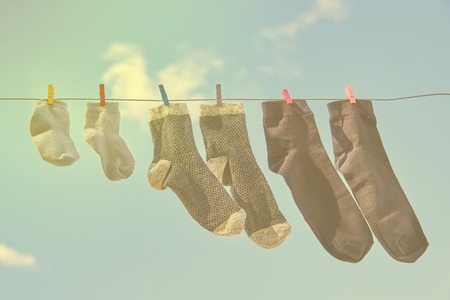 On the clothesline dry the socks of the whole family against the blue clear sky, toned photo