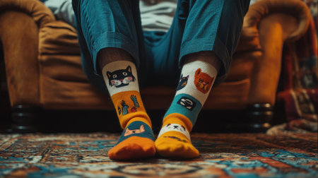 A playful image of feet in quirky animal-shaped socks, with a man sitting cross-legged on a carpet