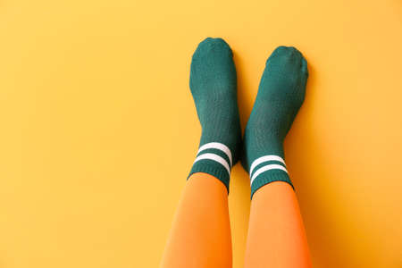 Women's legs in socks colors alternating, side stand on white fabric floor.