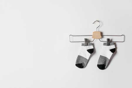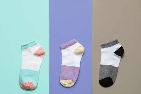 Multicolored children's socks without pattern, laid out in corner of frame, on white background with copy space, flatly, minimal style. Concept children's clothing, housekeeping.