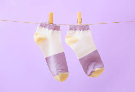 colored socks made of fine knitwear on a pink-blue background. Clothing in the form of socks.