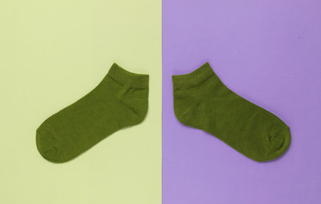 Pink socks on yellow background. Minimalism fashion concept. Pastel color trend.