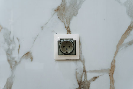 A white electrical outlet has been elegantly installed on a beautiful marble wall, which creates a striking contrast of textures and colors that enhances the overall refined design of the room